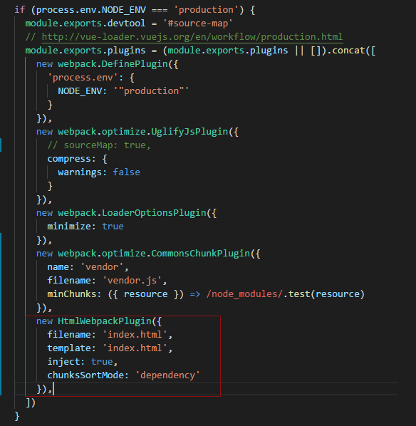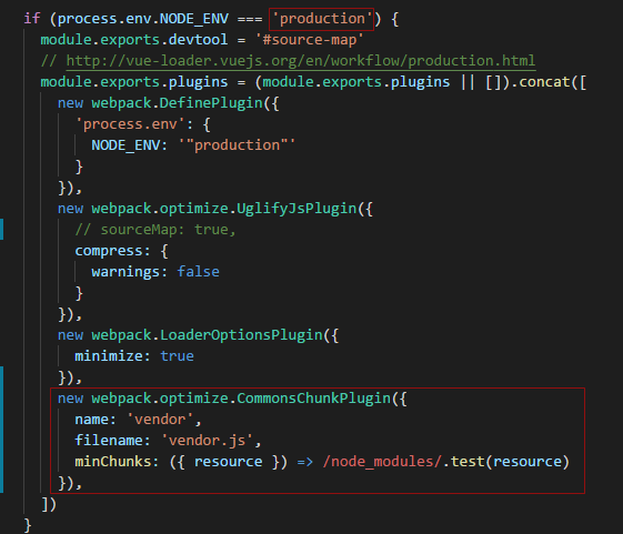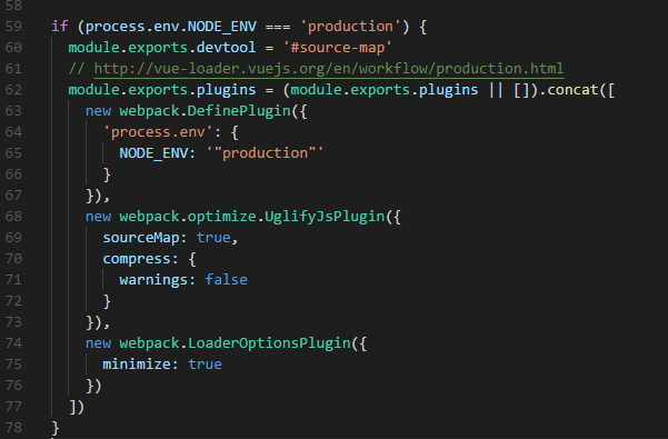 Porém como disse inicialmente, o Vue-cli já nos trás o webpack bem otimizado. Então iremos focar ao trecho que possui o process.env.NODE_ENV === ‘production’ . Neste trecho é que o empacotador Webpack faz algumas modificações para a versão final da build. Abaixo uma imagem deste trecho: