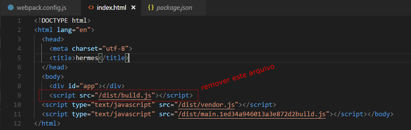 Por fim, precisaremos apenas remover o antigo arquivo de build,js de nosso novo html gerado, pois não é mais utilizado. Já os arquivos com nossa identidade digital no nome já são inseridos automaticamente.