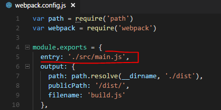 Vamos entender um pouquinho sobre este arquivo. Para começar, nosso arquivo precisa de um ponto de entrada na qual irá indicar qual módulo o webpack deve utilizar para construir seu gráfico de dependência interno. A partir daí ele irá também verificar quais outros módulos e bibliotecas esse pronto de entrada depende(direta e indiretamente). No nosso caso, este ponto de entrada é o entry: ‘./src/main.js’.