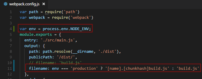 Com o plugin Common Chunks emite “chunkhash” que é atualizado se o conteúdo do arquivo for alterado. Assim, o webpack pode anexar esse hash aos nomes dos arquivos quando eles são exibidos. Faremos isso no início do nosso arquivo webpack.config.js deixando-o desta forma: