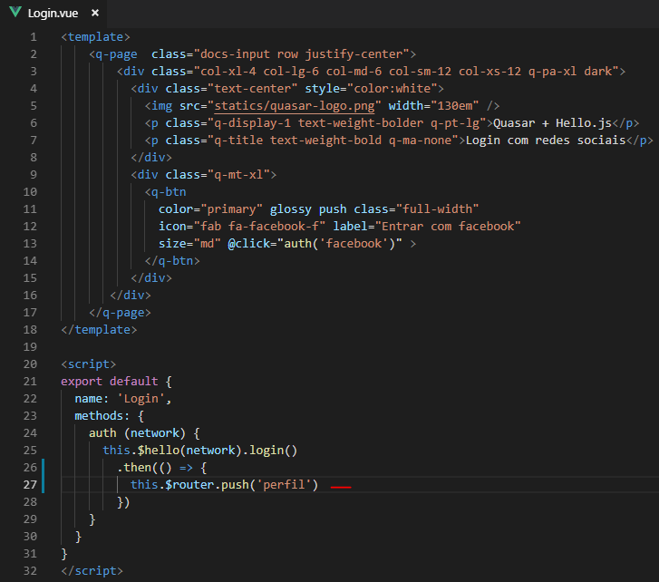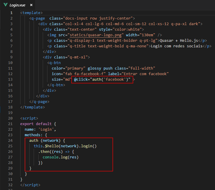 Agora vamos configurar nossa página Login.vue, com o método de login do hello js. Para isso criamos um método chamado auth() e implementamos o login da seguinte forma: