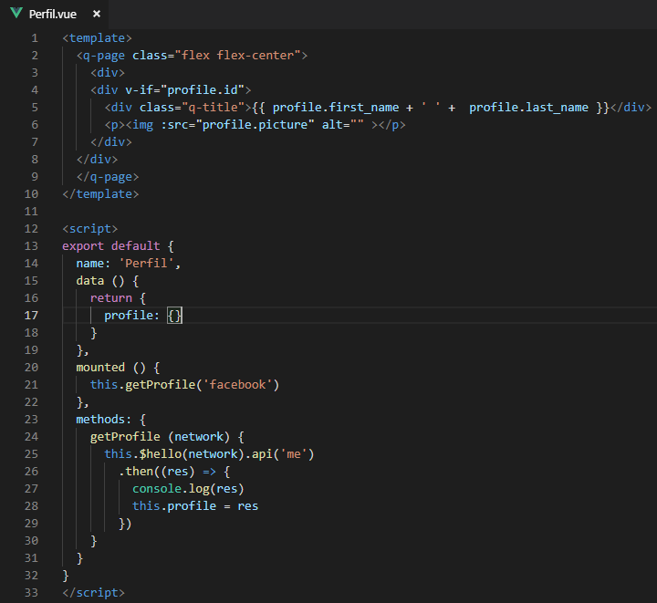 Agora iremos criar nossa page Perfil.vue no diretório src/pages com o seguinte código: