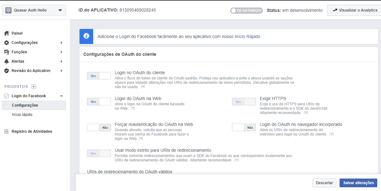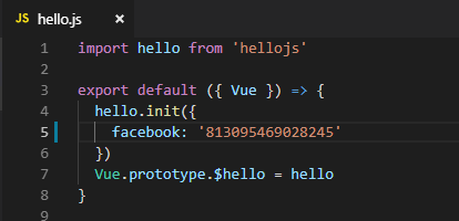 Pegue o id do aplicativo criado no Facebook for Developers e coloque no arquivo hello.js no diretório src/plugins da sua aplicação quasar: