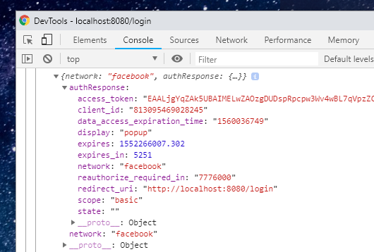 Ao autorizar nosso aplicativo recebemos como resposta um access_token, e alguma outras informações da api de autenticação do facebook. Em nosso console é possível ver:
