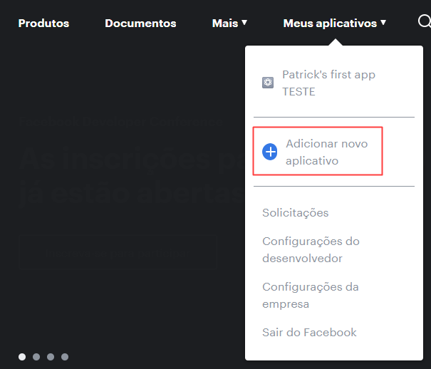 Após acessar a plataforma, clicamos em “Meus aplicativos” e em seguida em “Adicionar novo Aplicativo”: