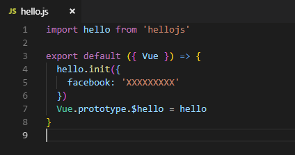 Para termos acesso ao hello.js dentro do quasar, iremos criar um simples plugin para isso. Dentro do diretório src/plugins criamos um arquivo hello.js com o seguinte código: