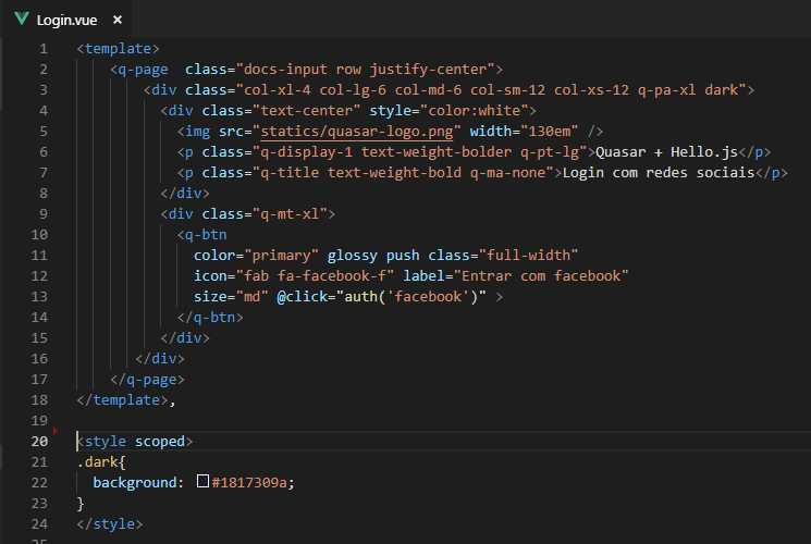 Agora iremos criar nossa página de login, para isso crie o arquivo Login.vue dentro do diretório src/pages com o seguinte código: