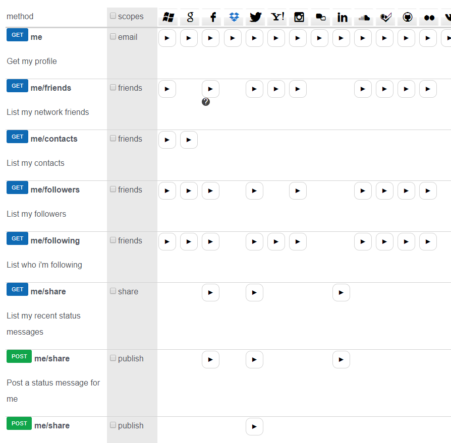 Algumas das possibilidades de autenticação com o hello.js :