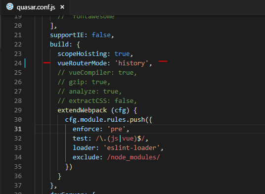 Observe que temos o hash(#) em nossa rota, vamos remover isso ativando o modo history em nossa configuração de rotas. Para isso, nós vamos no arquivo quasar.conf.js e tiramos o comentário da linha vueRouterMode: