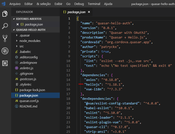 Para termos certeza que a instalação foi bem sucedida, abrimos nosso projeto no editor de texto de preferência e analisamos o arquivo package.json :