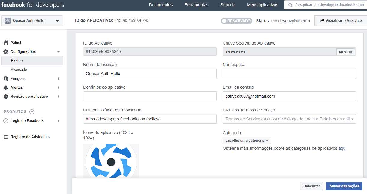 Agora acessamos Configurações-> Básico e precisamos de uma URL da Política de Privacidade. Para isso nós precisamos ter consciência das políticas e colocar o endereço dela no formulário. Você pode acessar as políticas através dessa URL. Além disso coloquei um ícone do quasar no tamanho 512 x 512 como ícone do aplicativo: