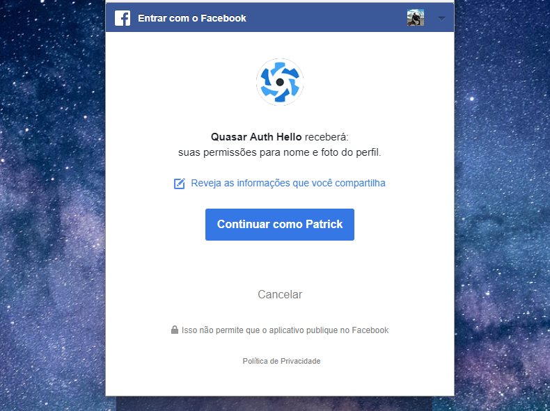 Agora acessando http://localhost:8080/login e clicando em nosso botão de login com facebook, o seguinte pop-up é apresentado na tela: