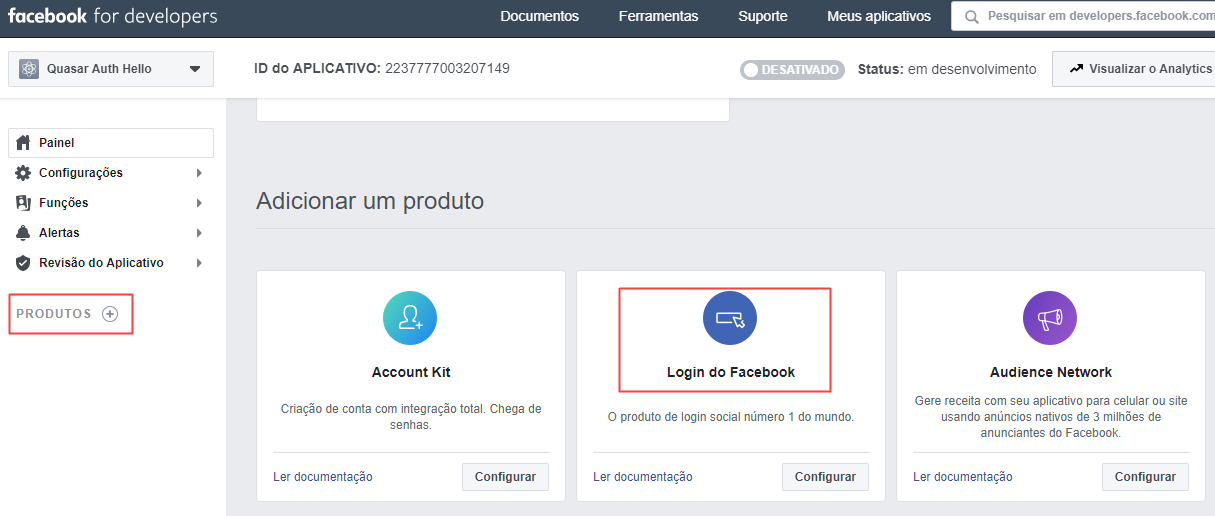 Na área do Painel clicamos em produtos na lateral, e buscamos por Login do Facebook e clicamos em configurar: