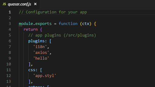 Além disso, adicionamos o nosso plugin hello em nosso arquivo quasar.conf.js :