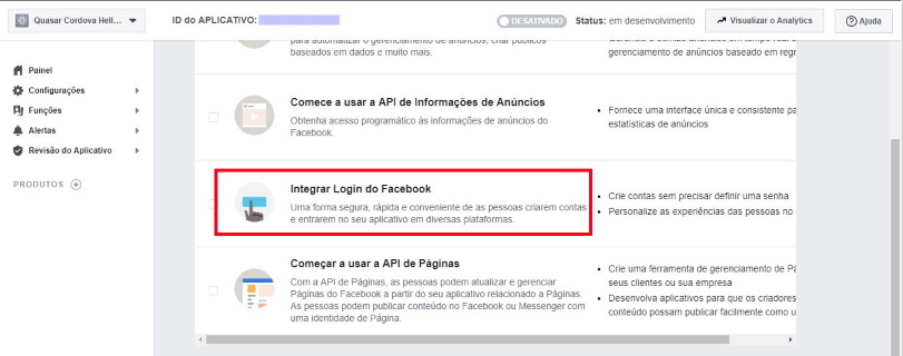 Na tela principal, clicar em “Integrar Login do Facebook”.
