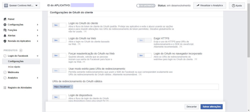 Em Produtos > Login do Facebook > Configurações, marcar todas as opções com “Sim” e informar  https://localhost/ no campo “URIs de redirecionamento do OAuth válidos”. Salvar as alterações.