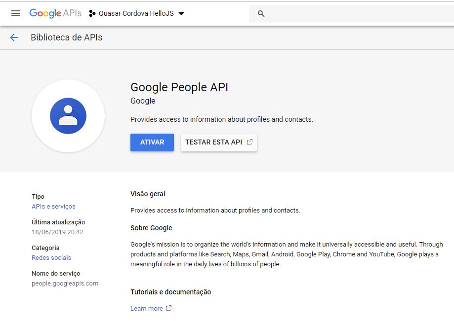 Acesse a tela “Biblioteca de APIs”, pesquisar por “Google People API” e pressionar em “ATIVAR”.