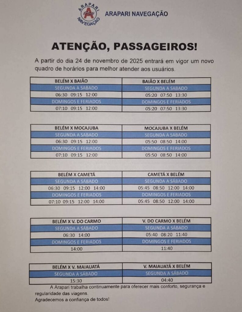 Durante a última semana de novembro, as empresas Jarumã e Arapari, responsáveis pelas viagens intermunicipais entre Abaetetuba e Belém, divulgaram diversas atualizações em seus horários de operação.