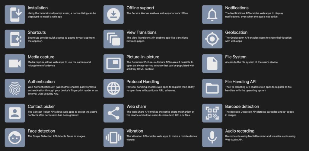Apesar dos avanços, algumas APIs ainda não estão disponíveis de forma completa no navegador, como acesso profundo a hardware (Bluetooth, NFC completo, ARKit/ARCore, etc.).